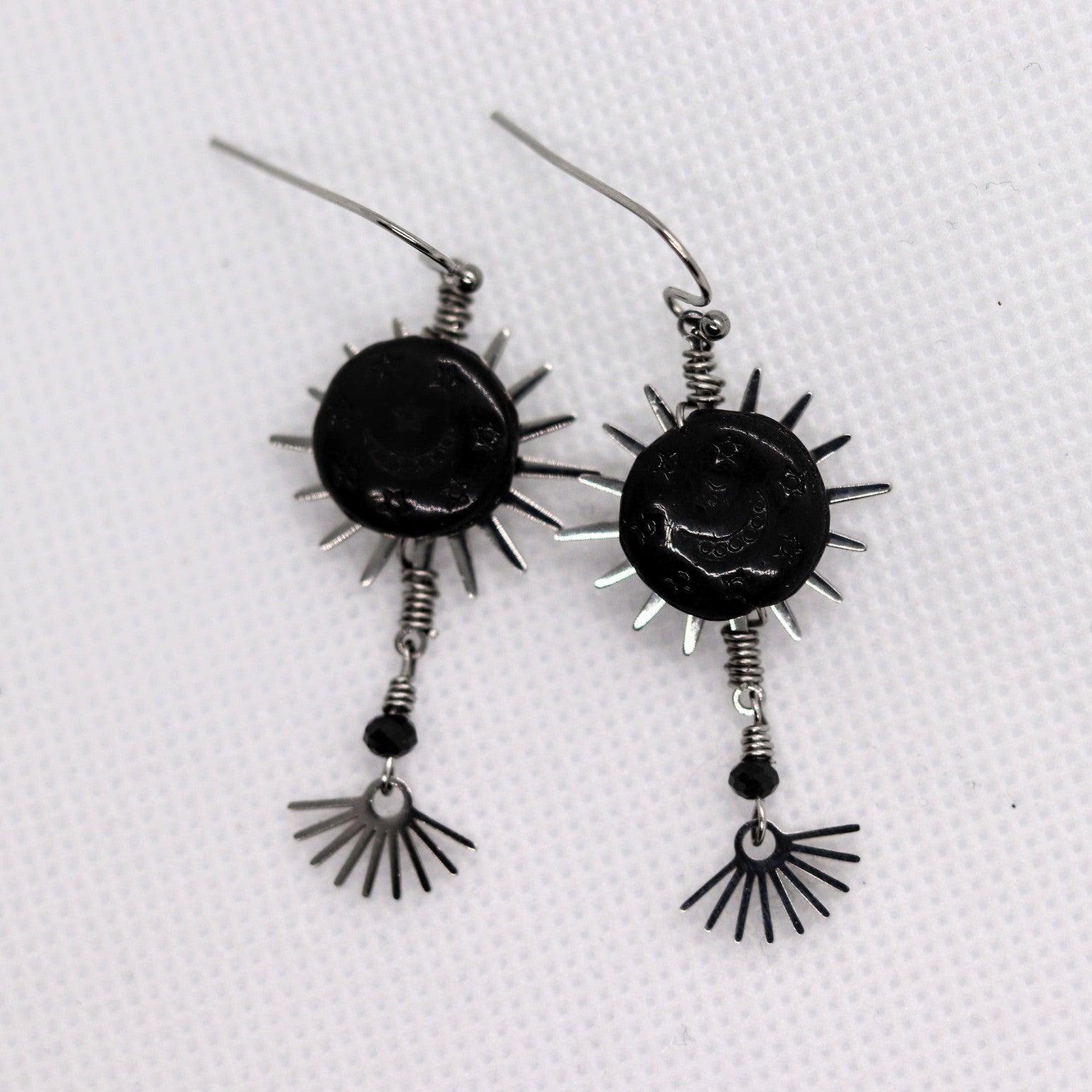 Handmade earrings crafted with Czech glass jet moon & stars c beads (13mm), stainless steel starburst pendants (26.5x22mm), stainless steel starlight charms (8x13mm), stainless steel earhooks & wire, & 3x4mm faceted genuine black spinal gemstone beads. Length is approximately 2 inches.