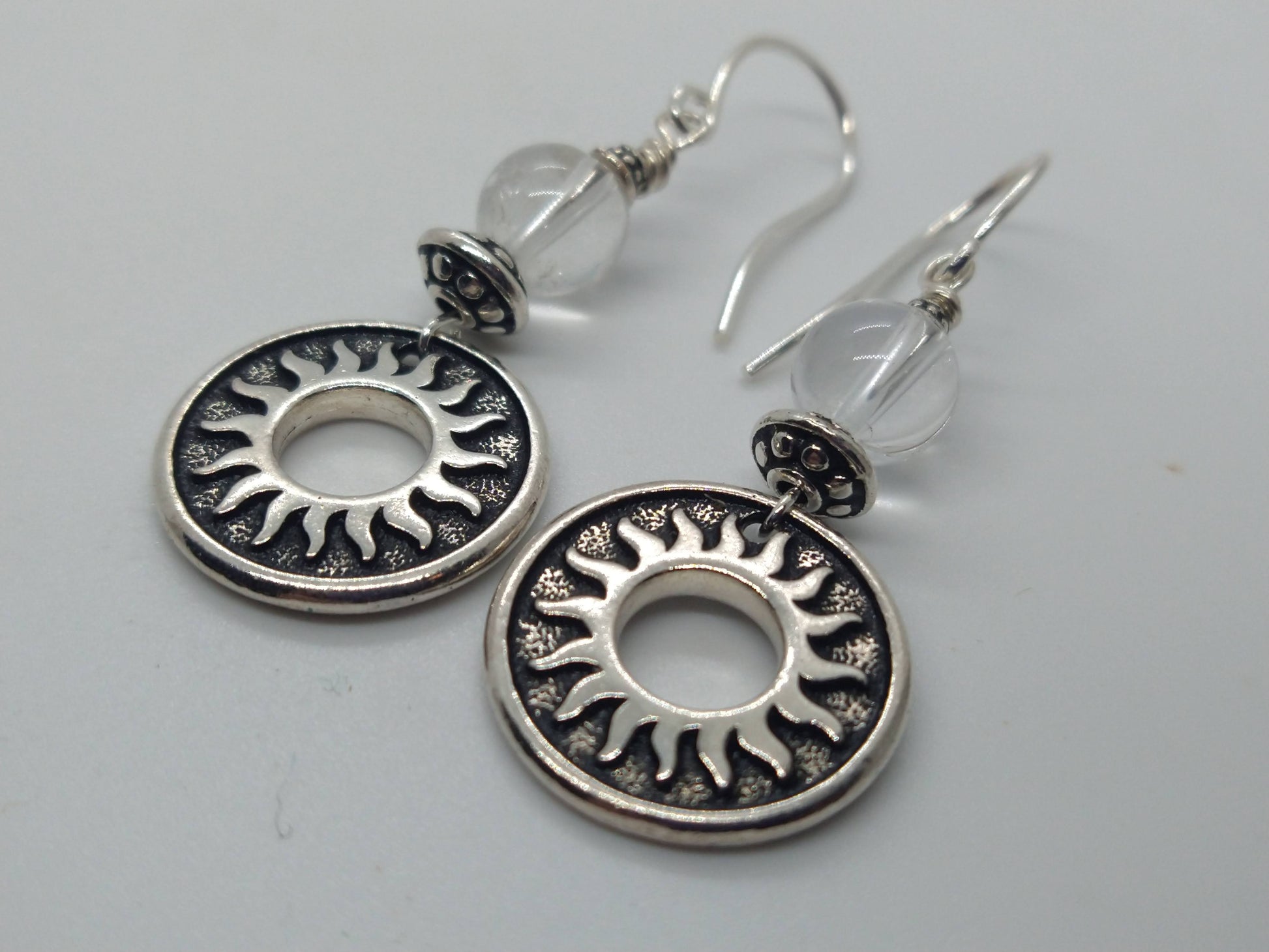 Del Sol sun charm earrings. Silver plated. Clear quartz beads.