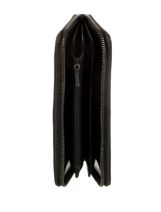 Pre-loved authentic and authenticated Gucci black leather Guccisma signature wallet, purchased from the Real Real and used once. It is stored in a dust bag, not included. Silver-Tone Hardware, Nylon Lining & Single Interior Pocket with Card Slots, Exposed Zip Closure. Pics are of actual wallet. Estimated item measurements Height: 4" Width: 7.25" Depth: 1"