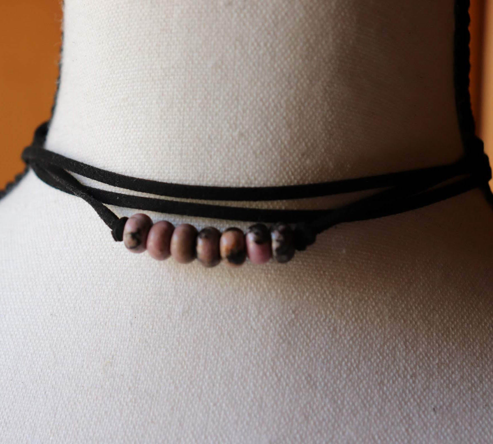 Natural rhodonite bead choker necklace in a versatile style for different looks. A convertible jewelry piece that can also be worn as a wrap bracelet. Microsuede cord