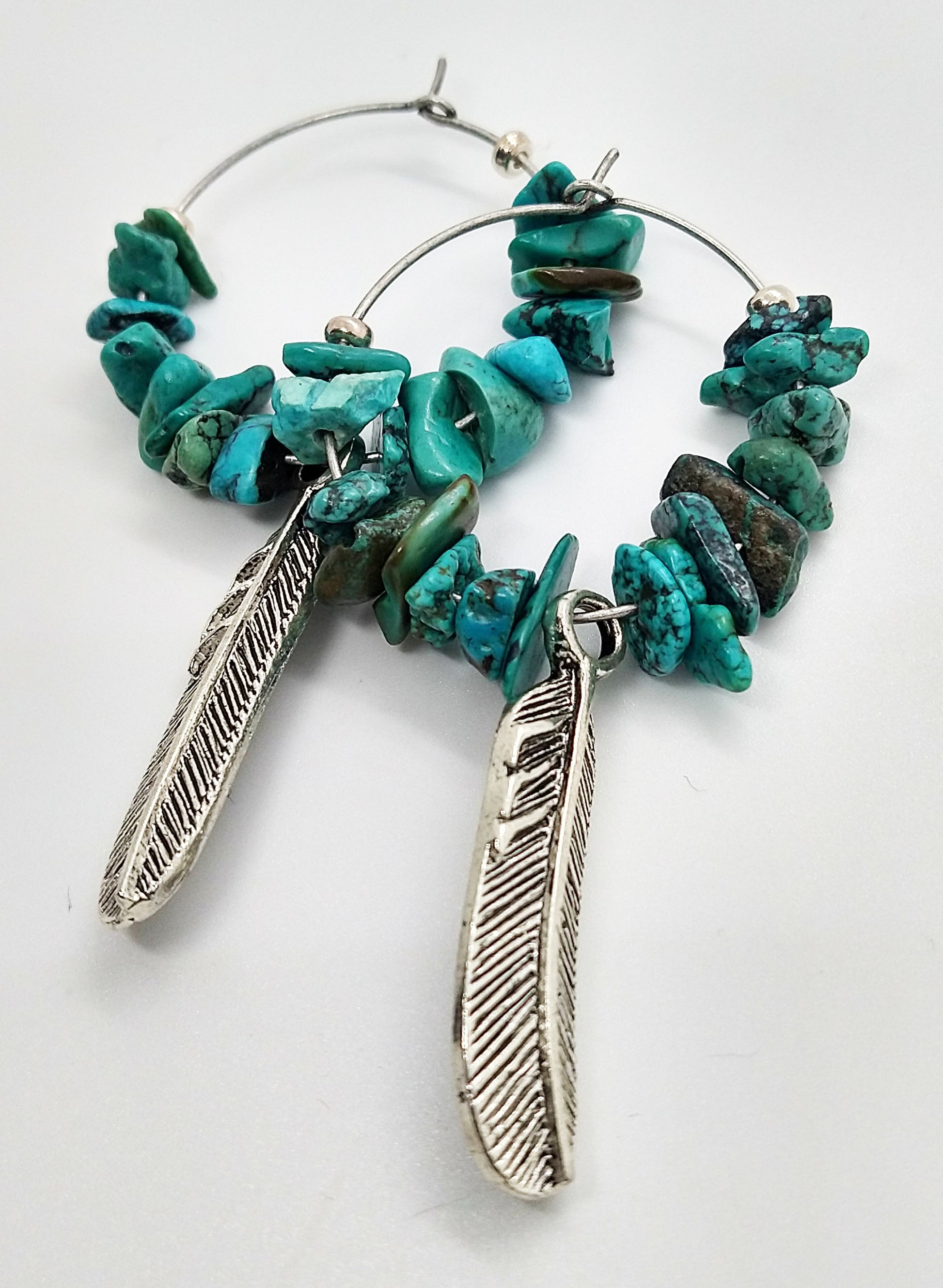 Genuine turquoise and antiqued silver (plated) feather hoops.
